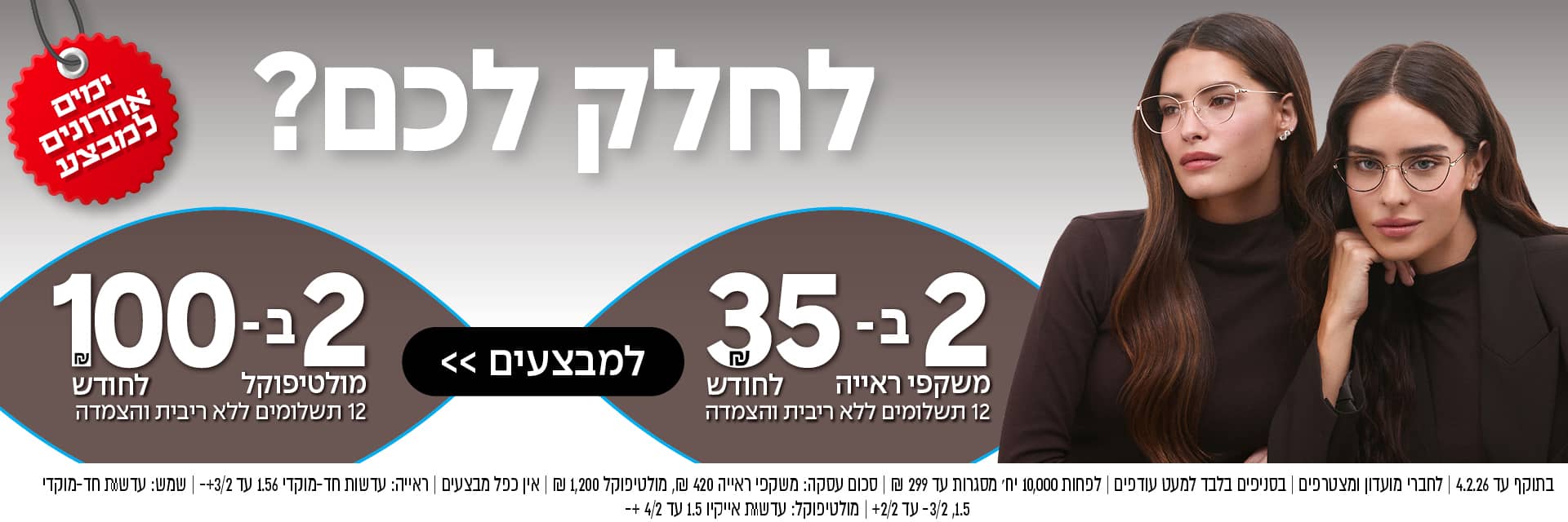 משקפי ראייה מהקולקציות הכי חדשות ממגוון מותגים מחו"ל, במחירים מדהימים עכשיו להזמנה אונליין או בסניפים. למה משקפי הראייה של הלפרין הם הטובים ביותר? בגלל האיכות, המקצועיות, העדשות וכמובן המחיר. באופטיקה הלפרין תהנו ממגוון ענק של משקפי ראייה, לנשים גברים, נוער וילדים, ממיטב הקולקציות של המותגים המובילים בעולם, ממבחר עדשות המיוצרות בטכנולוגיות המתקדמות בעולם ומליווי של צוות אופטומטריסטים מומחים מהשורה הראשונה אשר נמצאים בכל חנות וחנות.